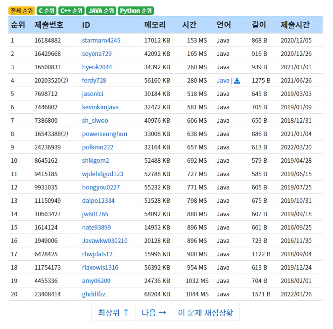 - 풀이 : 메모리 56160, 시간 : 280