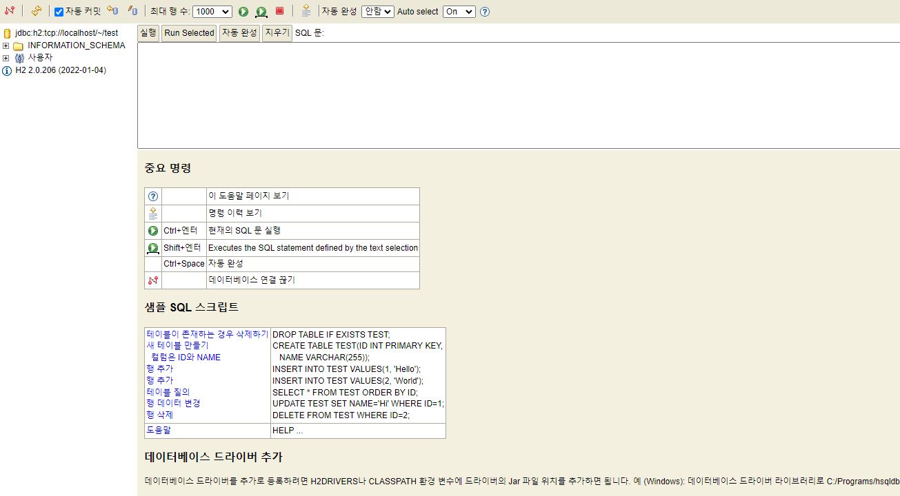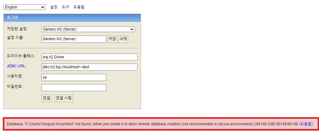 - 오류가 발생한 위 설정에서 JDBC URL: 부분을 jdbc:h2:~/test 로 바꾸어서 연결을 눌러주자.